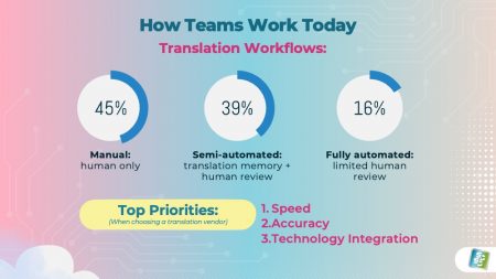 The survey found that most organizations still rely on a mix of manual and semi-automated workflows. Despite the proliferation of automated translation tools, 45% percent of respondents use fully manual translation, 39% use semi-automated processes that combine translation memory with human review, and 16% rely on fully automated systems with limited human review. When evaluating translation vendors, respondents reported their top priorities were speed, accuracy and technology integration.
