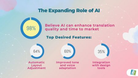 The findings show overwhelming optimism around artificial intelligence as the next step in translation and localization. An overwhelming 98% of respondents believe AI can enhance translation quality and time to market.The top features teams want most from AI-assisted tools include automatic layout adjustment (64%), improved tone and voice adaptation (60%), and integration with design tools (35%).